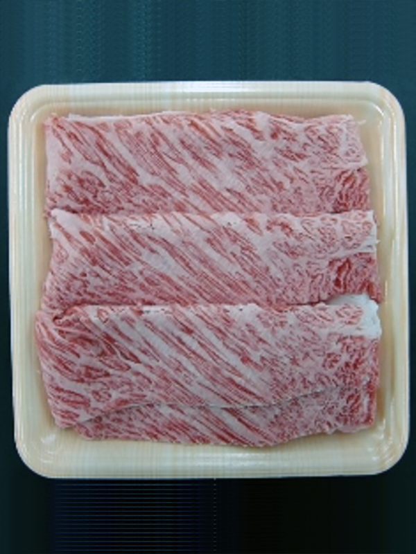 国産牛肩ロース部位のスライスを量販店様向けに定貫でトレイに盛り付けパックした商品です。